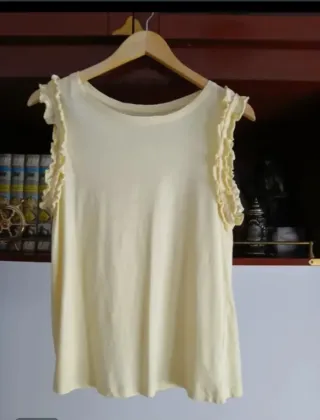 Camiseta sin mangas de color amarillo pálido. Presenta un diseño con volantes en los hombros. - Mangas con detalle de volantes. - Cuello redondo.