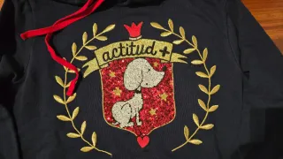 Sudadera con un diseño llamativo y original. Se vende por talla. Se ha probado en varias ocasiones pero no se ha usado. Agotada. Costo 70 euros - Estampado central con lentejuelas rojas y doradas. - Dibujo de perro y gato bordado. - Lazo rojo en la capucha. - Detalle de hojas doradas bordadas a los lados.