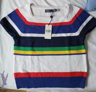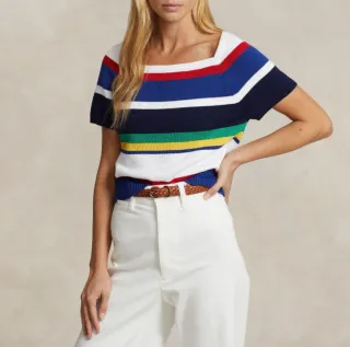 Jersey de punto de Polo Ralph Lauren con un diseño de rayas multicolor y escote cuadrado. Es una prenda sin estrenar, ideal para añadir un toque de color a tu armario. - Diseño de rayas horizontales. - Escote cuadrado. - Manga corta.