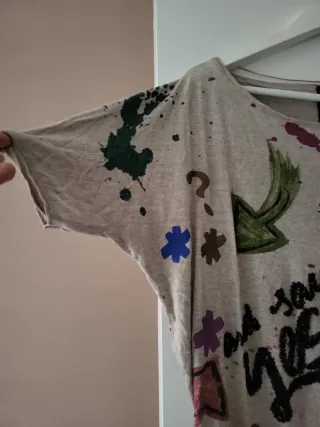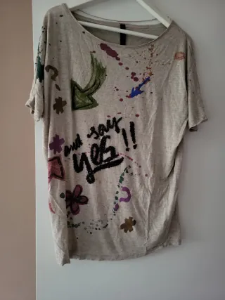 Camiseta de manga corta con un diseño original y llamativo. - Estampado de flechas, flores y salpicaduras de pintura. - Mensaje and say yes!! en letras negras. - Base en color beige con detalles multicolor.