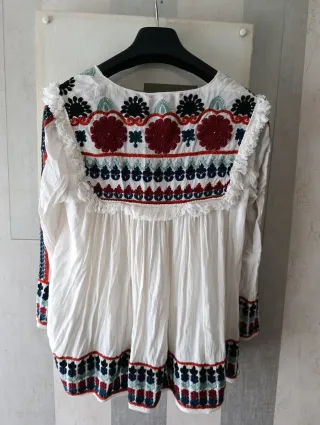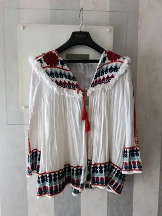 Chaqueta de Zara con un diseño bordado muy especial. - Mangas largas. - Cuello con volantes y detalle de flecos. - Bordados florales y geométricos en el cuello y bajo. - Cierre con cordones y borla roja.