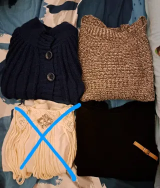 Conjunto de prendas de punto para mujer, ideal para la temporada de invierno. - Cardigan azul de punto grueso con botones.[poco uso] - Jersey marrón y beige de punto.[sin uso] - Jersey negro de punto.[Poco uso] Talla M Hago envíos Quedo en Gijón u Oviedo