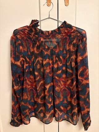 Blusa de manga larga con cuello alto. Se abrocha con un boton por detras. Esta nueva, sin uso