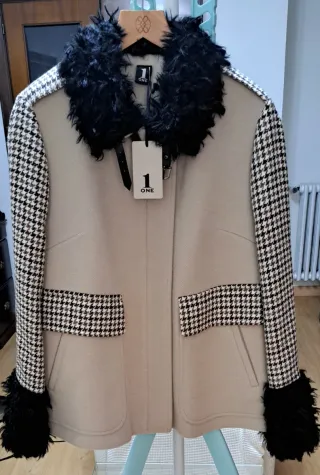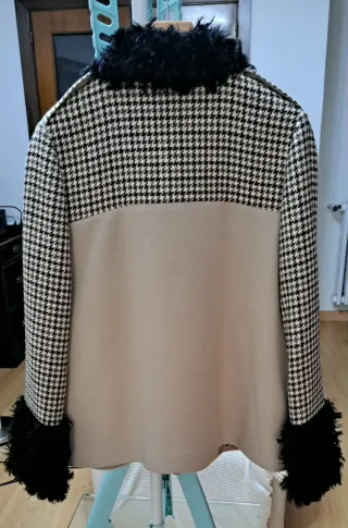 Elegante chaqueta de pura lana virgen con detalles en contraste, de la diseñadora italiana Isabella Julio - Diseño con cuello de pelo sintético negro. - Mangas y bolsillos con estampado pata de gallo. - Puños con detalle de pelo sintético negro.