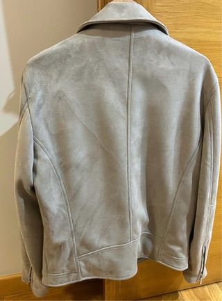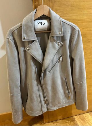 Cazadora estilo biker de Zara, en un bonito tono beige grisáceo. Es una prenda versátil y moderna. - Cierre de cremallera. - Bolsillos frontales con cremallera. - Detalle de solapas. - Material de tacto ante. -como nueva