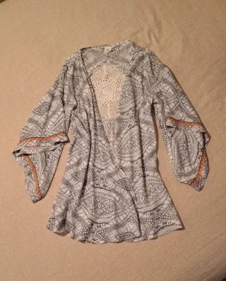 Bonita sobrecamisa con un estampado geométrico y detalles de crochet. - Diseño abierto. - Mangas acampanadas. - Ribete decorativo en las mangas.