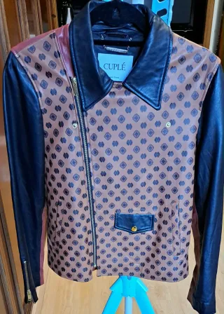 Cazadora de piel, estilo biker de la marca CUPLÉ con un diseño único. - Mangas y cuello de cuero negro. - Cuerpo de piel, con estampado de cuadros en tonos marrón y azul marino. - Cierre de cremallera asimétrica. - Bolsillo frontal con solapa y botón dorado.