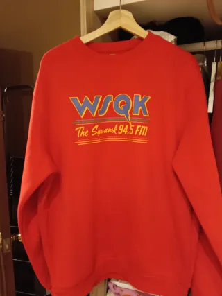Sudadera roja con el logo de WSQK The Squawk 94.5 FM. - Diseño llamativo con texto y líneas. - Cuello redondo y mangas largas.