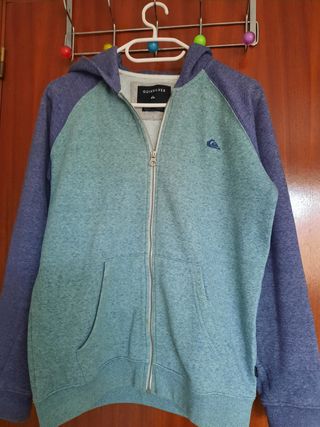 Conjunto de dos sudaderas con capucha de la marca Quiksilver y Mayoral - Talla S (equivalente a 14/16 años). - Diseño con mangas de color azul y cuerpo principal en tono verde azulado. - Cierre completo con cremallera. - Bolsillo tipo canguro en la parte delantera.