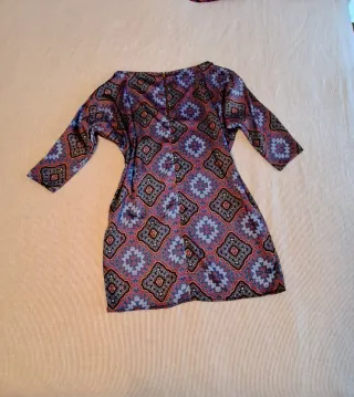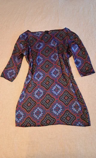 Vestido de manga larga con un llamativo estampado. - Diseño con estampado damasco en tonos beige y azul. - Mangas lisas en azul marino. - Cierre de cremallera en la espalda. - Medidas : largo 92cm, contorno 62