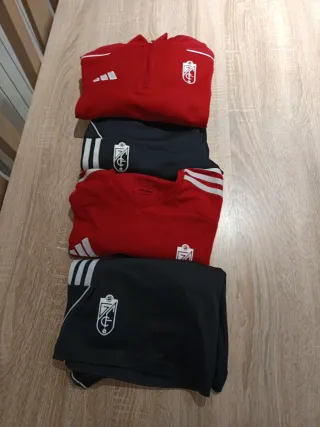 Conjunto de ropa deportiva Adidas del Granada. - Prenda superior roja con cremallera. - Prenda inferior negra con detalles blancos.