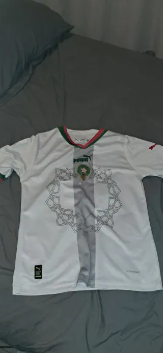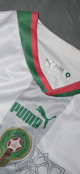 Camiseta de Marruecos de la marca Puma. - Diseño blanco con detalles en verde y rojo. - Escudo de Marruecos en el pecho. - Patrón geométrico en la parte frontal.
