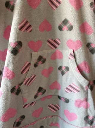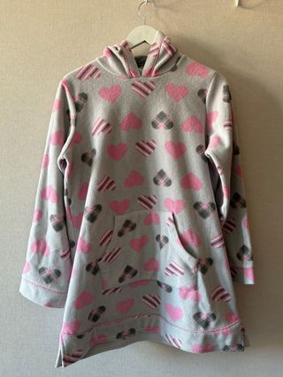 Bata cómoda con capucha y bolsillo delantero. - Diseño estampado de corazones rosas y grises. - Acabado suave al tacto.