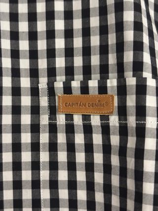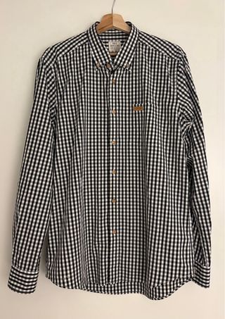 Camisa de manga larga con estampado de cuadros negros, grises y blancos. Los botones son de madera. Es de una marca española con fábrica en Albacete donde realizan todo el proceso de fabricación y costura. Usado muy pocas veces.