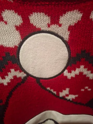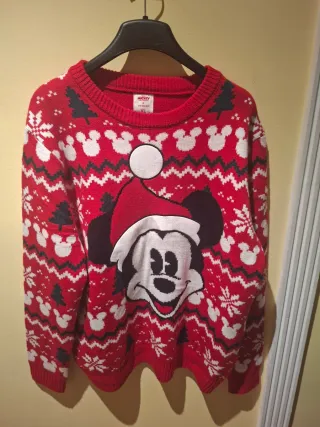 Jersey de punto con temática navideña de Mickey Mouse. Entrego en mano en Granada y Jaén - Diseño festivo con Mickey Mouse. - Estampado de copos de nieve y árboles y gorro de terciopelo - Cuello redondo y manga larga.