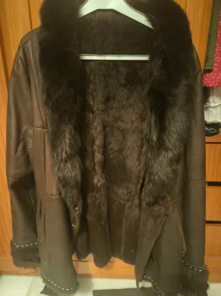 Elegante abrigo de piel auténtica con detalles de zorro. Una prenda clásica y cálida. - Piel de alta calidad. - Forro interior de pelo. - Cuello y puños con pelo de zorro. - Diseño con corte entallado.