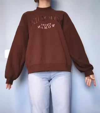 bordado en relieve “SELF-MADE STRONG WOMAN”, ideal para looks cómodos pero con actitud. Color marrón chocolate muy tendencia, fácil de combinar y perfecta para entretiempo o invierno. ✔ Corte recto ligeramente oversize ✔ Tejido suave y cómodo ✔ Cuello redondo clásico ✔ Estilo urbano / casual chic ✔ Ideal para looks diarios, universidad, viajes o planes informales Combínala con vaqueros, pantalón blanco o falda para un outfit juvenil y actual 💫 Prenda en muy buen estado. 📏 Talla: No tiene, alrededor de una M