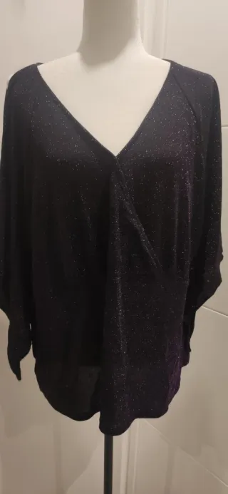 Elegante blusa con un toque brillante, perfecta para ocasiones especiales. - Diseño cruzado. - Mangas amplias. - Tejido con destellos.