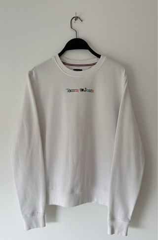 Sudadera blanca de Tommy Jeans con un diseño sutil y moderno. - Logo de Tommy Jeans bordado en el pecho con hilo de colores. - Cuello redondo. - Puños y bajo elásticos.