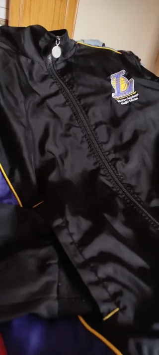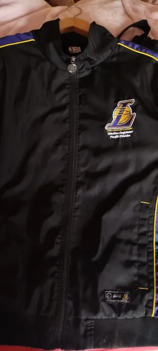 Chaqueta deportiva de los Lakers. - Diseño con detalles en morado y amarillo. - Cierre de cremallera frontal. - Logo de la NBA en la etiqueta. - Impermeable.