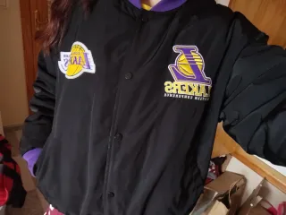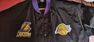 Chaqueta estilo bomber con el logo de los Lakers. - Diseño con parches. - Cuello y puños morados. - Es la M pero da talla.