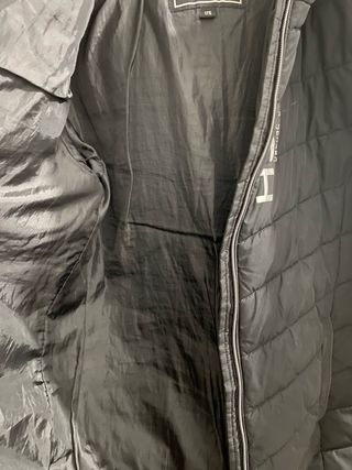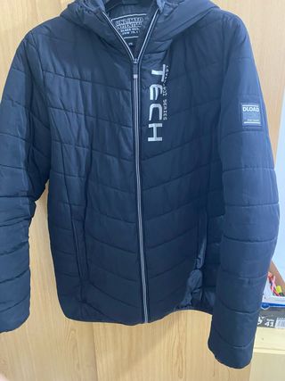 Chaqueta estilo tech en color negro. - Diseño acolchado con líneas diagonales. - Cierre frontal con cremallera. - Capucha integrada. - Detalle de texto TECH en la parte frontal. - Parche DLOAD en la manga.