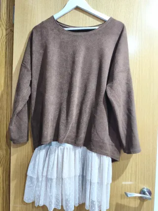 Conjunto de dos piezas. - Parte superior de manga larga en color marrón. - Falda con volantes en color blanco.