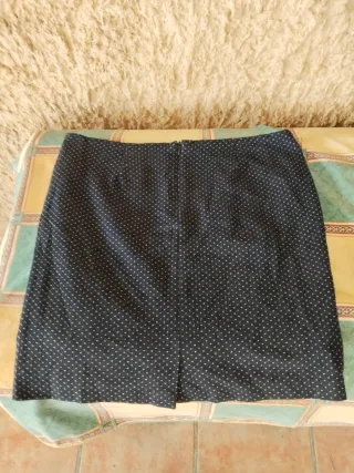 Elegante falda de corte recto con un discreto estampado. - Diseño de puntos blancos sobre fondo azul marino - Cintura con pinzas para un mejor ajuste. - Largo medio muslo