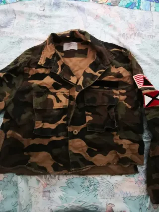 Chaqueta con estampado de camuflaje. - Diseño de cuello camisero. - Cierre de botones. - Bolsillos en la parte delantera. - Puños abotonados. - Detalle de parches en la manga.