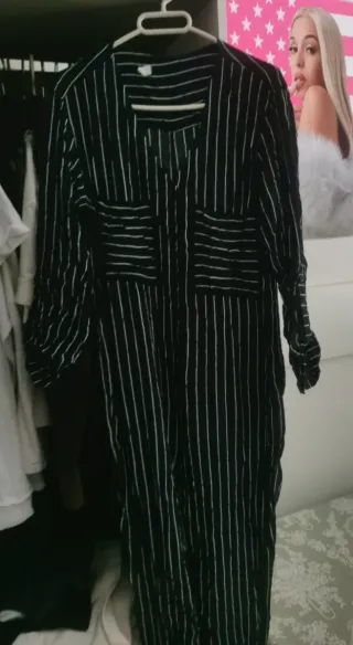 Mono de rayas verticales en blanco y negro. Tiene un diseño de camisa con botones y bolsillos en el pecho. - Mangas largas con opción de remangarse. - Cuello camisero. - Cierre de botones.