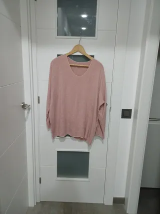 Conjunto de prendas de ropa en talla 52 Chaqueta tejana - Jersey de punto fino rosa - Diseño de cuello en V. Chaqueta oberside gris Sobre jersey gris