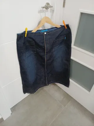 Falda vaquera de corte recto. - Diseño con bolsillos delanteros. - Cremallera frontal. - Bajo deshilachado. Pantalón negro recto de punto fino fino Jersey gris de invierno Vestido lino color kaki