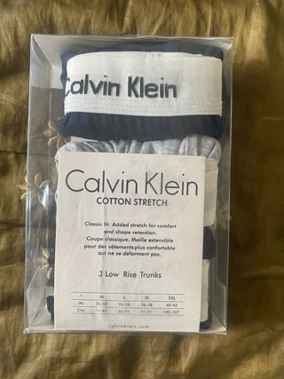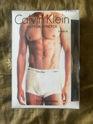 Paquete de tres calzoncillos Calvin Klein para hombre. Incluye los tonos negro, blanco y azul, cada uno con la clásica cintura elástica con el nombre de la marca. Se puede hablar el precio.
