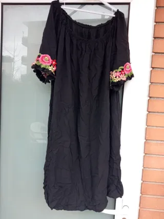 Blusa larga de color negro con un diseño bordado en las mangas. - Mangas con bordados florales en tonos rosa, rojo y verde. - Escote elástico para llevar al hombro. - Tejido ligero y vaporoso.