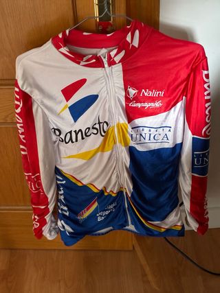 Chaqueta de ciclismo Nalini con diseño del equipo Banesto. - Mangas largas. - Cierre de cremallera frontal. - Logos del equipo y patrocinadores visibles.