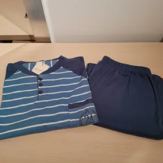 Conjunto de pijama para Hombre de tejido fino. 85%algodón y 15% poliester. Incluye camiseta de manga larga y pantalón largo. Jersey cierre con 3 botones y bolsillito bordado. Talla XL medidas: 🧥 axilas 57cm largo 72cm 👖 cintura 36 y estirado 61cm Precio == 10 euros. - Camiseta con estampado de rayas azules y blancas. - Cuello redondo con botones. - Bolsillo en el pecho. - Pantalón liso azul marino.