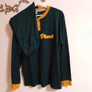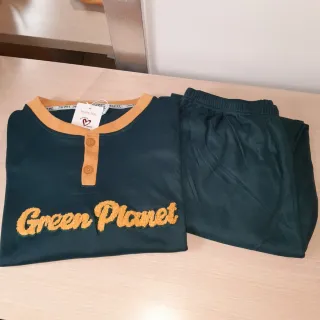 Conjunto de pijama para Hombre con un diseño moderno y cómodo. Afelpadito por el interior. 85%algodón y 15%poliester. Color verde con letras delante, cierre con 2 botones. Pantalón liso. Talla 3XL medid 🧥 axilas 66cm largo 74cm 👖 cintura 38 y estirado 62cm largo 108cm. Precio == 12 euros. - Parte superior de manga larga con cuello redondo y 2 botones. - Pantalón largo a juego. - Detalle bordado Green Planet en la parte delantera de la camiseta. - Acabado afelpado para mayor calidez.