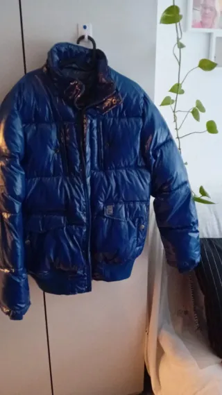 Abrigo azul talla L, me queda grande. Le falta el gorro. - Diseño acolchado. - Cremallera frontal. - Bolsillos con solapa.