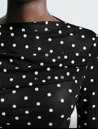 Camiseta de manga larga con un diseño de lunares blancos sobre fondo negro. Tela de gasa, con efecto de transparencia. - Diseño de lunares. - Cuello drapeado. - Manga larga.