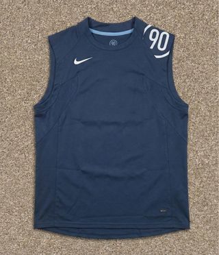 Camiseta deportiva Nike sin mangas en color azul. Perfecta para entrenamientos. - Tecnología Dri-Fit para mayor transpirabilidad. - Detalle 90 en hombro y cuello. - Logo de Nike en blanco.