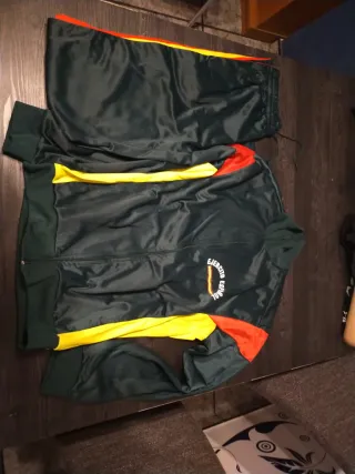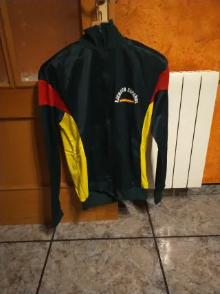Conjunto de chándal vintage del Ejército Español. Ideal para coleccionistas o amantes de la moda retro. - Chaqueta con cremallera completa. - Pantalón con cintura elástica y cordón. - Detalles de color amarillo y rojo en mangas y laterales.