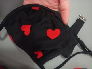 Conjunto de lencería de baño con un diseño llamativo. Talla S y M , depende de pecho o dimensiones. - Estampado de corazones rojos. - Cierre con corchetes. Parte de arriba y pareo a juego ¡ De regalo un gorrito de playa 7up!