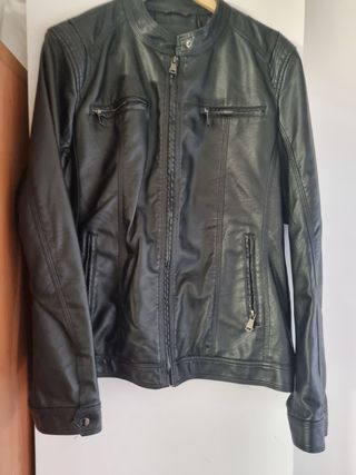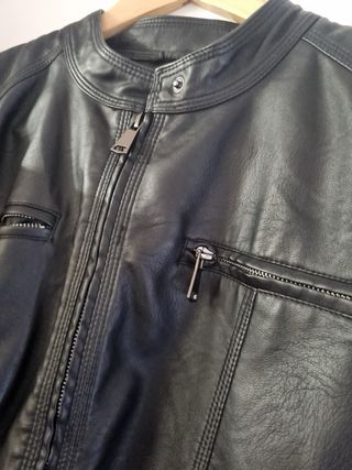 Cazadora de efecto piel con un diseño moderno y versátil. - Cuello redondo. - Cierre de cremallera frontal. - Bolsillos con cremallera. - Puños ajustados.