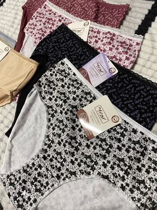 Pack de tres braguitas de algodón para mujer con estampado floral. Añadido de toalla en zona íntima ,se hace ver en la segunda foto! Varias tallas disponibles - Tejido suave y transpirable. - Cintura elástica con detalle de encaje. - Diseño cómodo para el día a día.