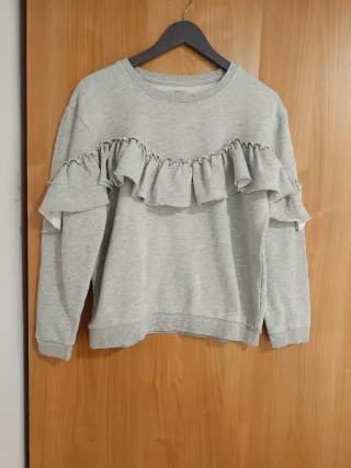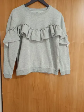 Sudadera gris de la marca Only, talla L. Presenta un diseño moderno con volantes. - Detalle de volantes en la parte delantera. - Manga larga. - Cuello redondo. Medidas largo 60 cm medidas de axila a axila 54 cm medidas de hombro a hombro 50 cm. Como nuevo puesta en 2 ocasiones.