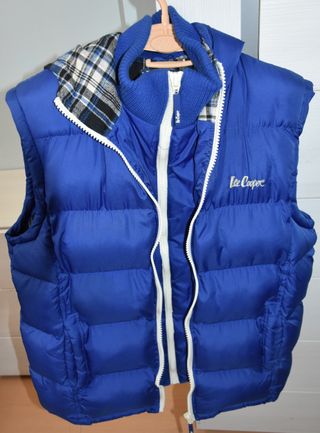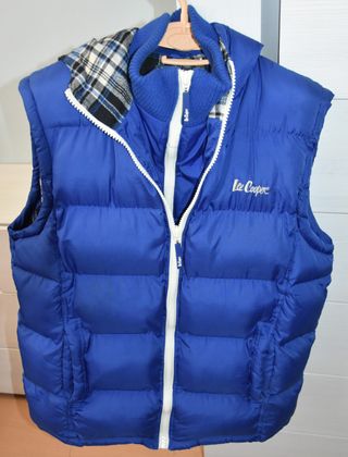 Chaleco acolchado de la marca Lee Cooper para hombre. Está en muy buen estado. Talla L. -Forro interior a cuadros. - Diseño con capucha. - Cierre de cremallera. - Bolsillos laterales.