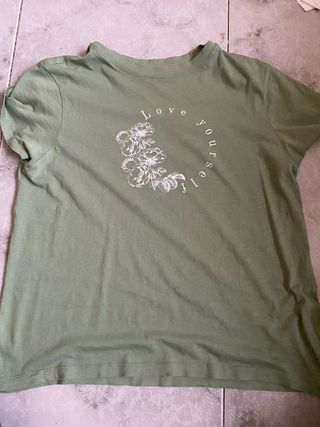 Camiseta de manga corta con un diseño circular de flores y la frase Love yourself. - Estampado blanco. - Cuello redondo.
