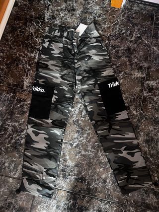 Pantalones de estilo cargo con estampado de camuflaje. Cuentan con bolsillos laterales y un diseño moderno. - Estampado de camuflaje en tonos grises y negros. - Bolsillos cargo en los laterales. - Detalle de logo Trikk en los bolsillos. -Con ajustador en los tobillos