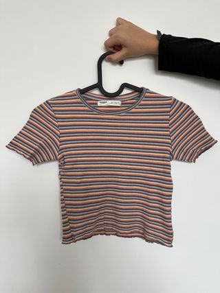 Camiseta de manga corta con un diseño de rayas multicolor. El tejido es acanalado y los bordes de las mangas y el bajo tienen un acabado festoneado. - Diseño de rayas horizontales. - Tejido acanalado. - Acabado festoneado en mangas y bajo.