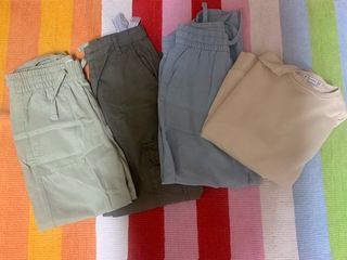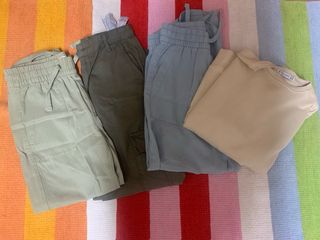 Conjunto de ropa en talla XS (equivalente a 34). - Pantalón cargo verde. - Pantalón cargo verde claro. - Pantalón cargo azul claro. - Sudadera beige.